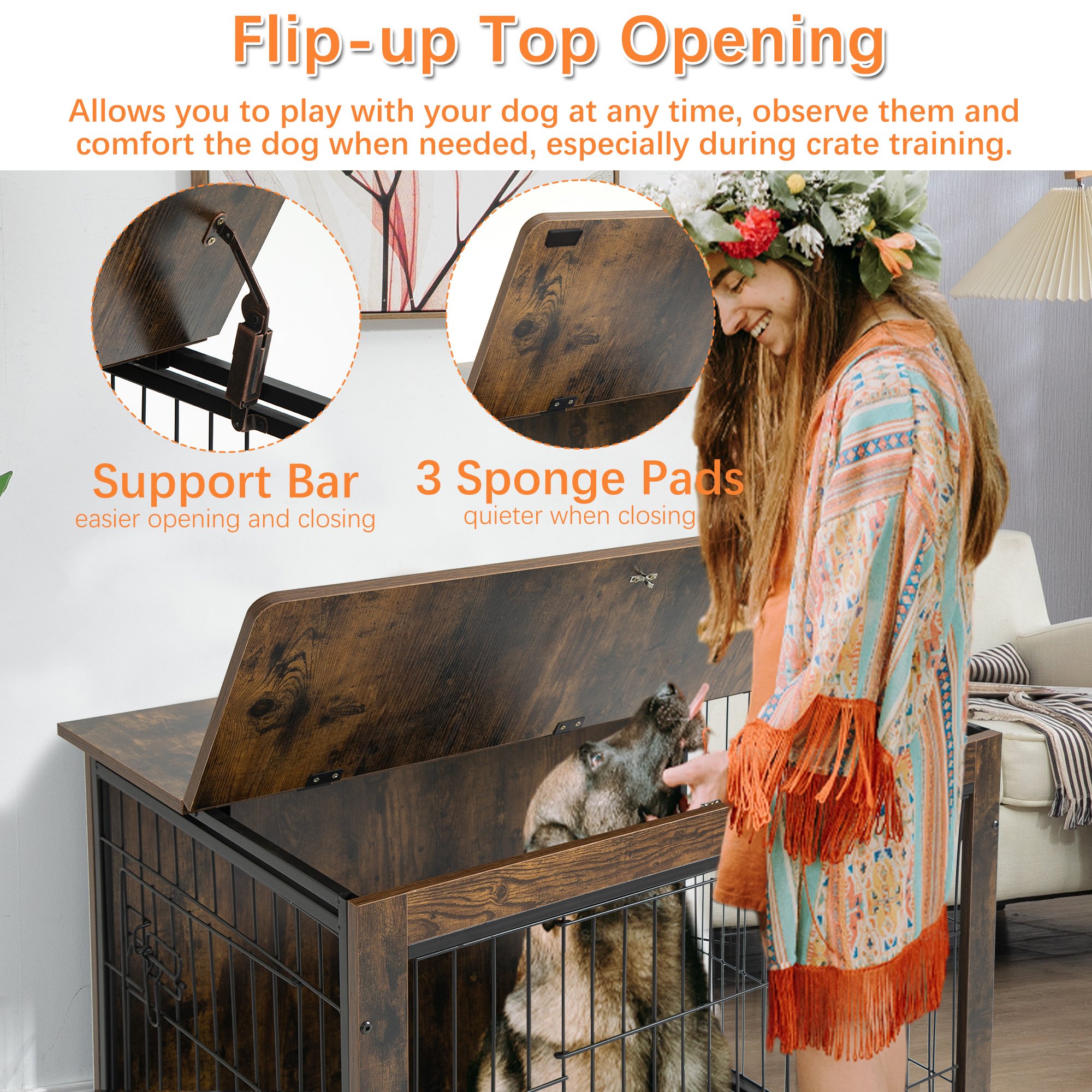 Style meets function with this versatile wooden indoor kennel that serves as a secure space for your pet as well as a practical piece of furniture that easily blends with your interior design. This heavy-duty dog crate is conveniently on rolling casters to be able to move to any room in the house. Dog cage three generously sized entry points including a wide double-door, single side-door, and horizontal lift-top provide easy accessibility. The pet crate two front-facing doors are equipped with premium latches to securely shut closed. Pet cage high-quality iron bars enclose the open-air design to allow for proper ventilation and 360 degree visibility. Give your pet a safe place to rest that doesn't obstruct your room decor thanks to this furniture-style dog pen!