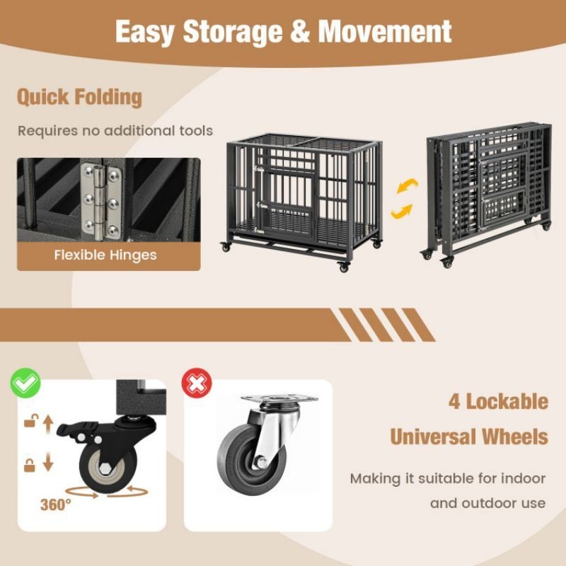 Foldable Heavy-Duty Metal Dog Cage Chew-proof Dog Crate with Lockable Universal Wheels